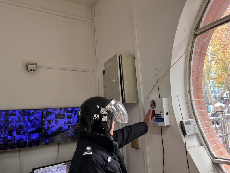 随着演练正式启动,学校门前一名“歹徒”翻过伸缩门冲入学校,门口值班的保安人员发现这一情况,迅速作出反应,启动一键报警通知增援并立即手握钢叉警棍上前挡住“歹徒”,正当紧急时刻,其他安保人员立即赶来,马上手持警棍、钢叉等防暴工具与“歹徒”对峙,大家齐心协力把“歹徒”制服……