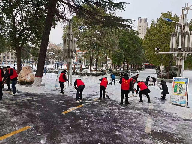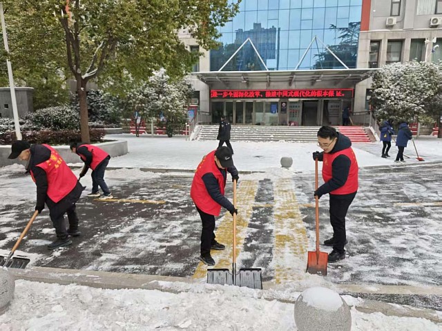 大家合理分工、默契配合。党员身先士卒,有的用铁锹铲起路面的积雪和薄冰,有的用扫帚将松散的积雪扫向路边,有的则合力清理堆积较厚的雪堆。虽然天气寒冷,但每个人都干劲十足,“叮叮当当”声在校园回响,大家额头上渐渐冒出了汗珠。